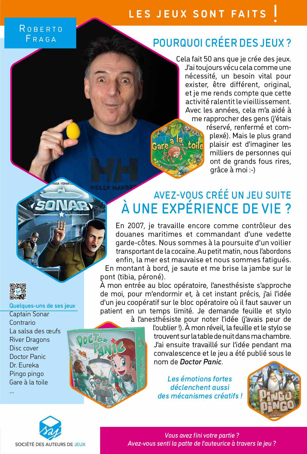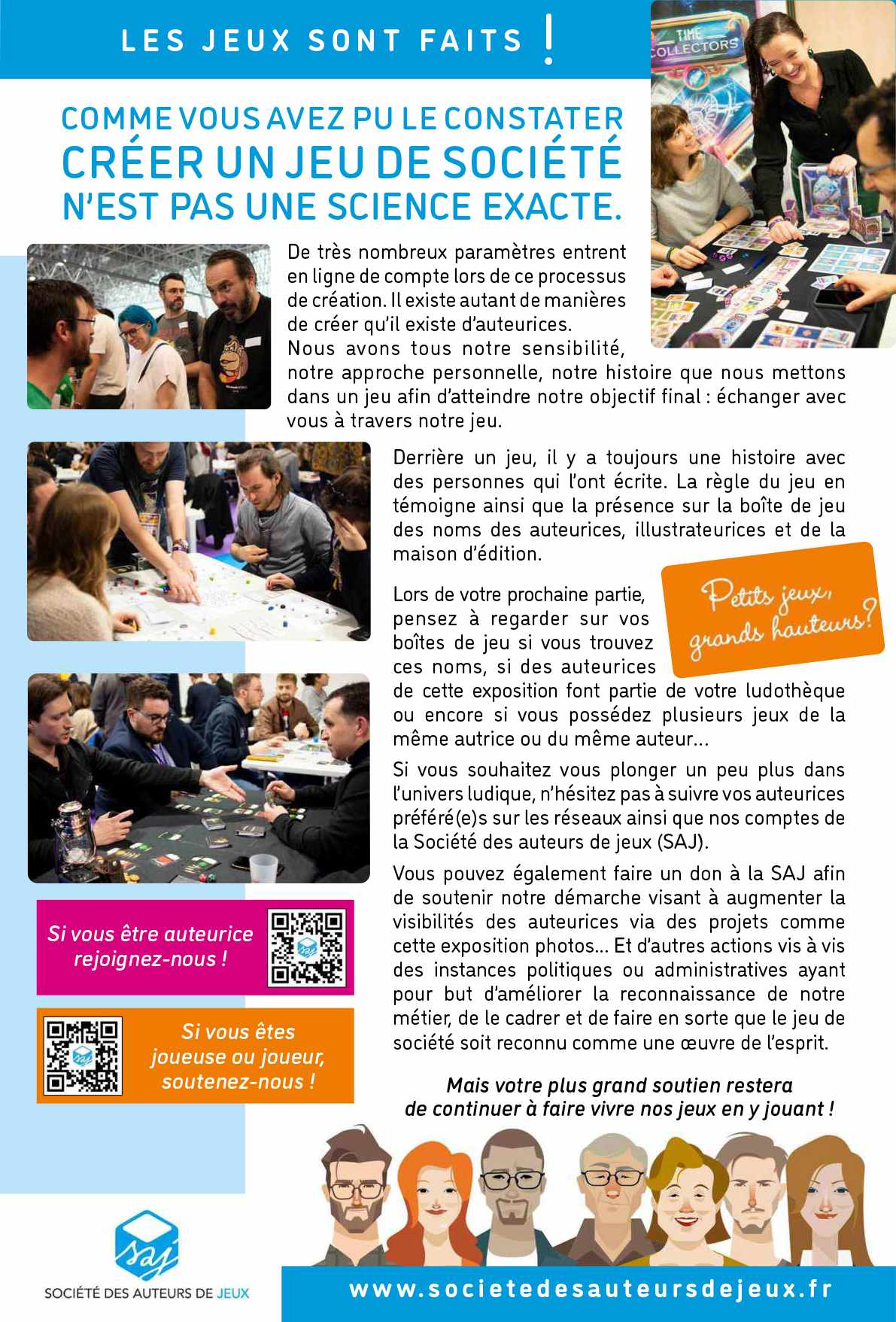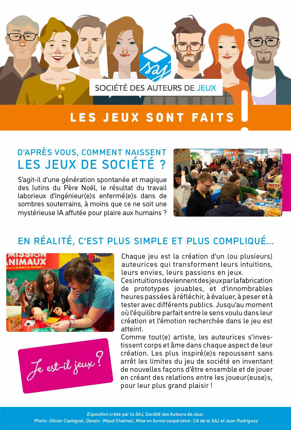 L’exposition “Les jeux sont faits !” est composée de 30 panneaux présentant des auteurices de tout âge et de tout horizon. Chaque panneau est constitué d’un portrait d’un auteurice, avec une photo, un extrait d’interview et quelques-uns de ses jeux. En plus de ceux-ci, 2 panneaux d’introduction et 1 de conclusion sont présents pour contextualiser l’exposition.